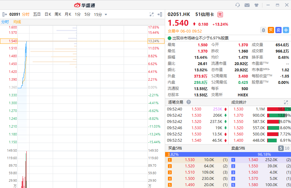 华盛资讯6月3日消息,51信用卡早盘获直线拉升,目前涨13.24%,报1.54港元每股,总市值20.92亿港元。