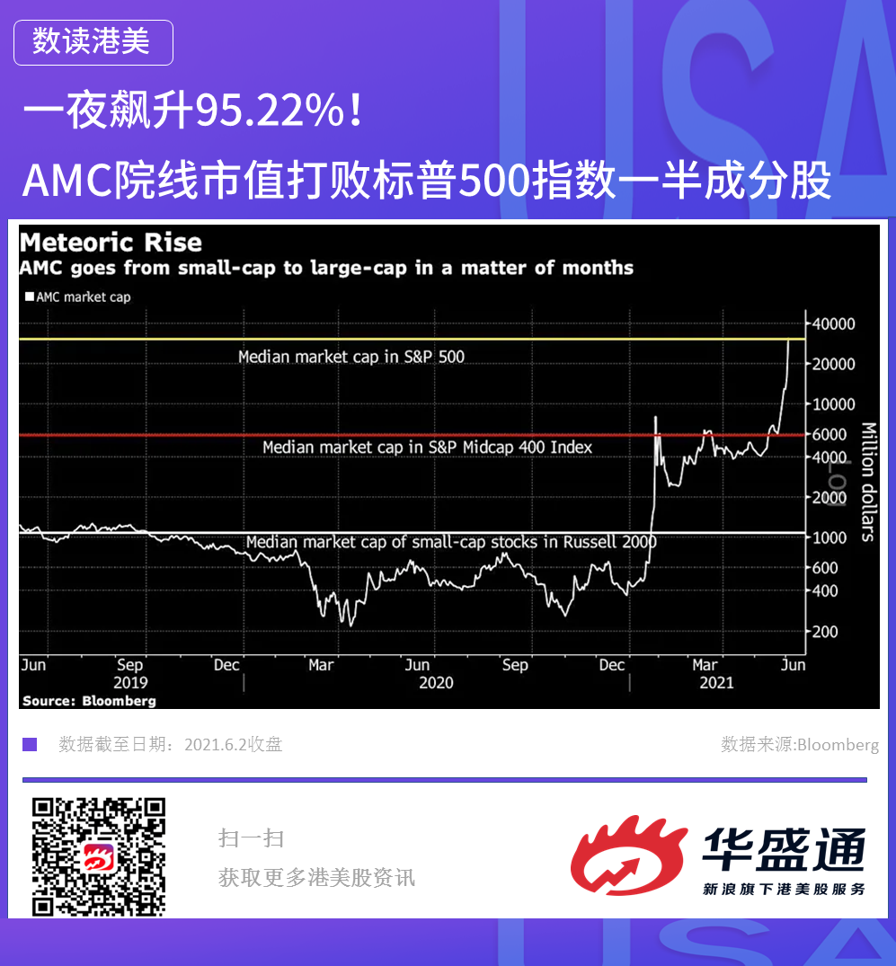 这也意味着,短短几个月时间里,AMC院线市值依次跨过了罗素2000小盘股市值中位数和标普400中型股市值中位数,从小盘股逆袭为大盘股,一举超越了标普500指数中一半的公司,甚至比泰森食品(TSN)和达美航空(DAL)更值钱。