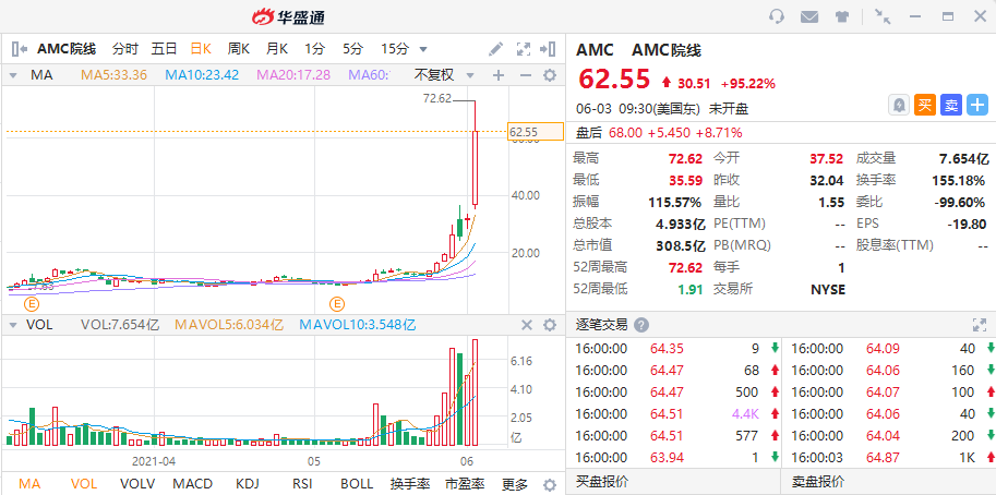 尽管AMC院线在尾市涨幅有所回落,但仍然收涨95.22%,也就是说在仅仅不到半年的时间,AMC院线累计涨超2850%。