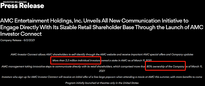 根据AMC官网发布,截至2021年3月11日AMC院线共有320万个人投资者股东,持股比例达到总股本的80%。