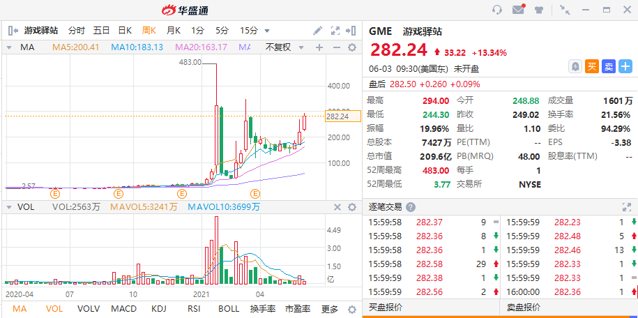 在2021年1月28日游戏驿站股价一度触及483美元历史新高,但在2021年2月份其股价一度杀至38.5美元水平,最大跌幅近92%。