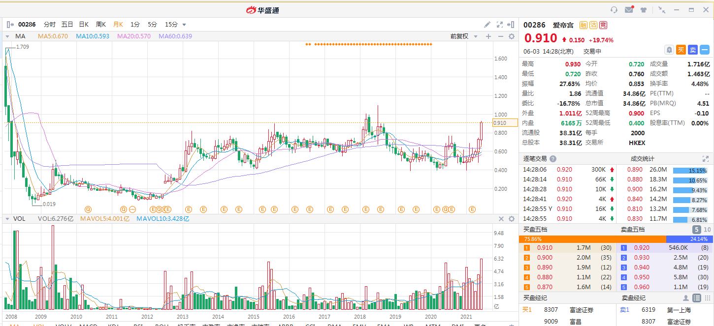 华盛资讯6月3日消息,三孩概念股爱帝宫午后不断上涨,目前涨超19%,股价创2018年7月以来新高。截止发稿,爱帝宫上涨19.74%,现报每股0.91港元,总市值34.86亿港元,成交额1.463亿港元,换手率4.48%。