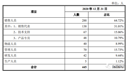值得一提的是,445员工中,优宁维的生产员工数量,仅有5人,与之相对应,其销售人员多达288人。