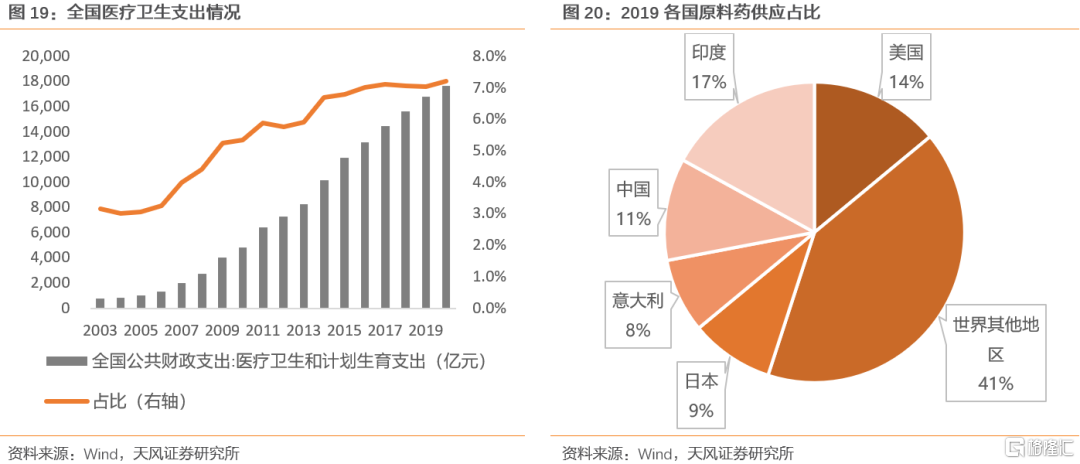 与此同时,印度疫情的爆发,也将在中长期内重塑中国药企的全球份额。截至5.31,印度单日新增确诊病例仍然有12.6万人,累计确诊病例达到2817万人。而中国和印度是全球两大原料药供应国,2019年份额分别为11%和17%,在特色原料药领域是竞争关系。一旦疫情加剧,印度原料药出口供应将会受到较大影响,而在需求刚性的情况下,部分订单可能会转移至国内,有利于国内药企扩大市场份额。尽管后续印度疫情逐步缓解之后,可能会存在订单回流的情况,但这个过程中,中国药企的全球竞争力以及全球份额有望重塑。