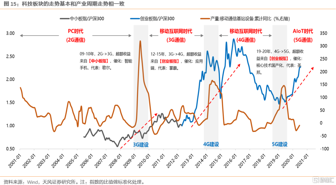 从过去20年的回顾来看,科技板块每一轮大行情的展开都与产业周期的支撑密不可分。在每一轮科技板块大行情启动前,往往都会看到移动通信基站设备同比增速的持续走高,对应背后的逻辑就是产业周期的更迭。在09-10年附近,随着3G产业周期的到来,智能手机开始逐步对传统的手机进行替代,对应以歌尔股份为代表的中小板指取得显著的超额收益。而在12-15年,随着3G产业周期向4G产业周期切换,内容端逐步开始向视频端过渡,手游、自媒体等应用端领域受益,对应以掌趣科技为代表的创业板指获得超额收益。当前正处在4G产业周期向5G产业周期切换的过程中,5G引领新一轮科技浪潮,从硬件建设->软件内容->应用场景,将成为下一轮经济周期的新引擎。2019年开始,5G基础设施加速建设,往前看,5G的应用场景可能进一步延伸至物联网、VR/AR、智能家居、无人驾驶、人工智能、智慧城市等领域,这些或将成为下一轮经济周期的新引擎,整个科技板块全产业链受益。