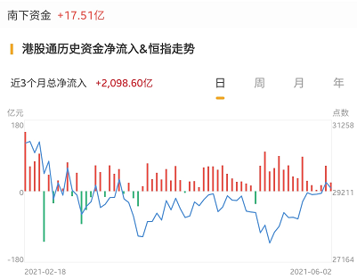 南下资金今日净流入港股高达17.51亿港元,昨日为净流入超22亿港元。