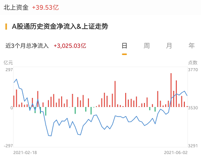 北上资金今日净流入39.53亿元,昨日为净流入超6亿元。