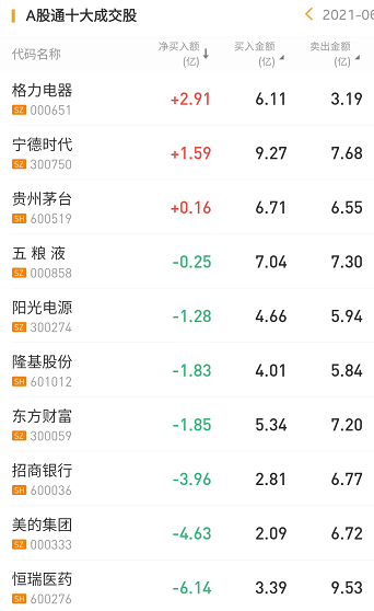 北上资金今日净买入格力电器2.91亿元,为今日买入之最。此外,北上资金净买入宁德时代1.59亿元,净买入贵州茅台0.16亿元。