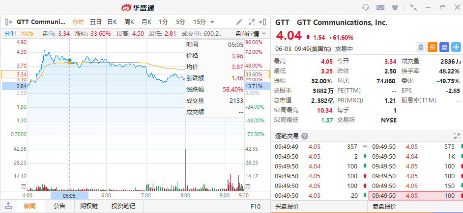 华盛资讯6月3日消息,美股早盘,云端网络服务公司GTT Communications(GTT)大涨超60%,报4.04美元,Workhorse(WKHS)涨32%,报15.34美元,两家公司均是高做空比率的个股。