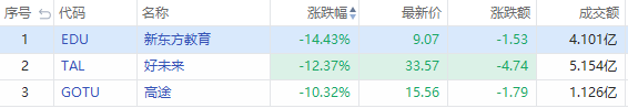 华盛资讯6月3日消息,美股早盘,知名中概股普跌。截至发稿,美股在线教育板块持续走低,新东方(EDU)跌超14%, 好未来教育集团(TAL)跌近12%,高途(GOTU)现跌超10%。