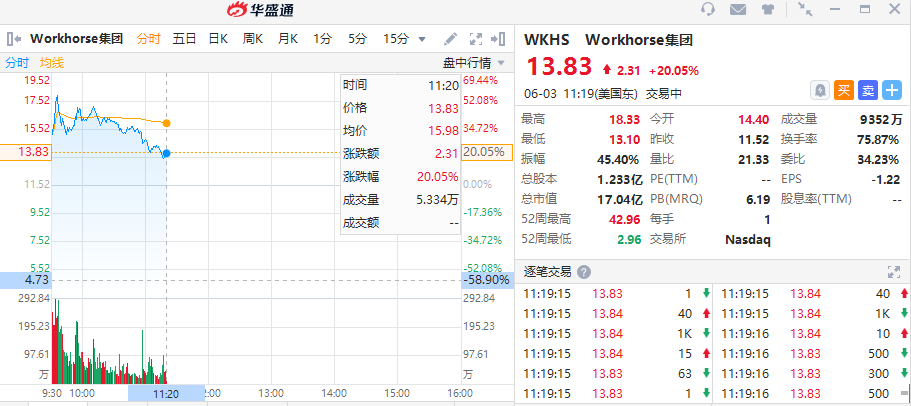 Workhorse(WKHS.US)盘初大涨近60% 近期数据显示大量美国散户进入该股