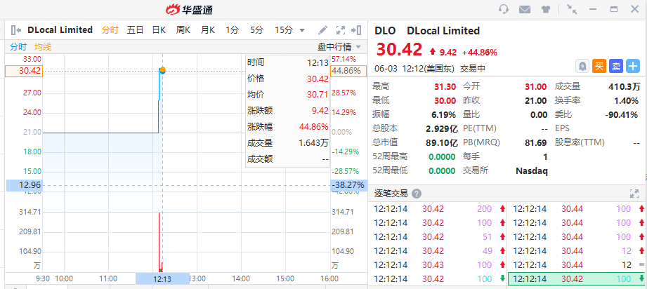 华盛资讯6月3日消息,乌拉圭跨境支付处理公司DLocal今日挂牌纳斯达克,上市首日开涨超40%,股价报31美元。截至发稿,该股上涨44.86%,股价报30.42美元。