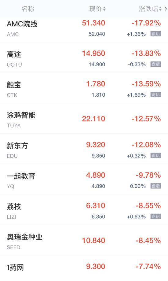 高途跌近14%,好未来、触宝跌超13%,涂鸦智能、新东方跌超12%,一起教育跌近10%,荔枝跌超8%,趣头条、1药网跌超7%,网易有道跌近7%,第九城市跌超6%,哔哩哔哩跌近6%,知乎、迅雷、中网载线、优信跌近5%,拼多多、爱奇艺、微美全息、斗鱼跌超4%,百度、金山云、猎豹移动跌近4%,雾芯科技跌超3%,陌陌跌近3%,唯品会、欢聚集团跌超2%,阿里巴巴、京东、网易、携程跌超1%。