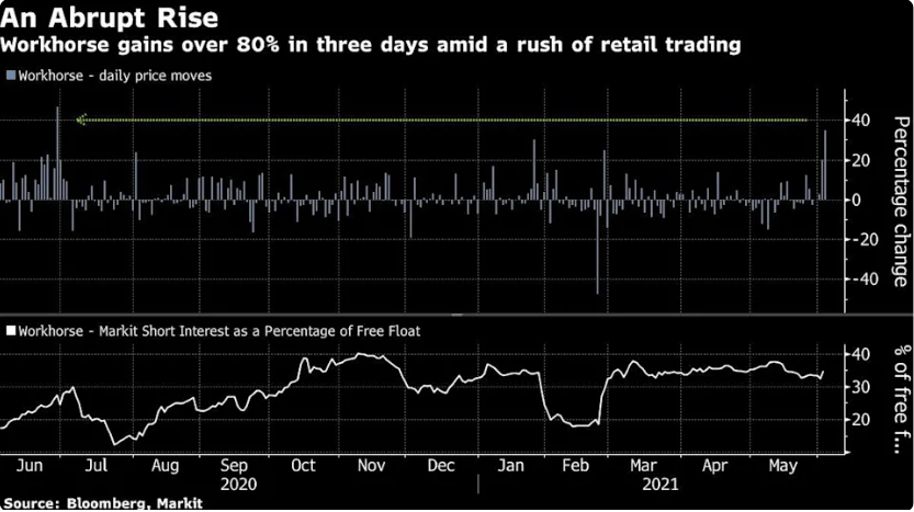 除了行情宛如过山车的AMC,经常浏览热门投资论坛Reddit的散户近日还一直在大举买入一家陷入困境的电动卡车初创公司Workhorse,在短短三个交易日内就将其股价推高逾80%。