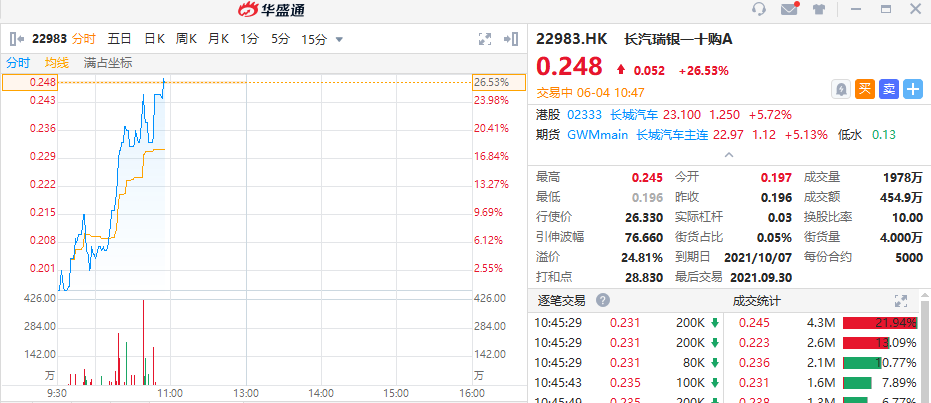 相关涡轮方面,长汽瑞银一十购A跟涨26.53%,其行使价为26.33港元,到期日为2021年10月7日,溢价24.81%。