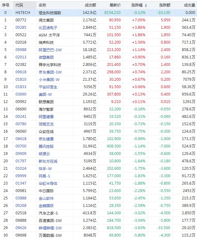 阅文集团涨7%;比亚迪电子涨超3%;瑞声科技、ASM太平洋涨超1%。