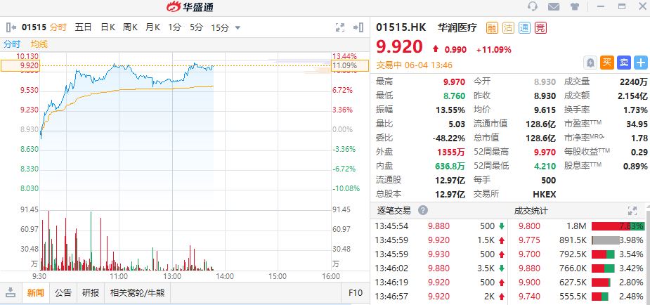 华盛资讯6月4日消息,华润医疗午后持续上涨,截止发稿,华润医疗涨11.09%,现报每股9.92港元,总市值128.6亿港元,成交额2.154亿港元,换手率1.73%。