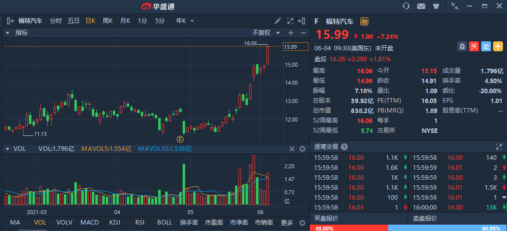 福特股价在尾盘上涨7.7%至16.04美元,而道琼斯工业平均指数和标准普尔500指数都在下跌。福特股价收于15.99美元,上涨7.2%。