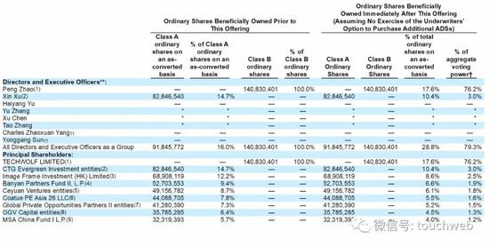 IPO前,赵鹏拥有140,830,401股B类股,持有100%的B类股,CTG Evergreen Investment entities持有14.7%的A类股;