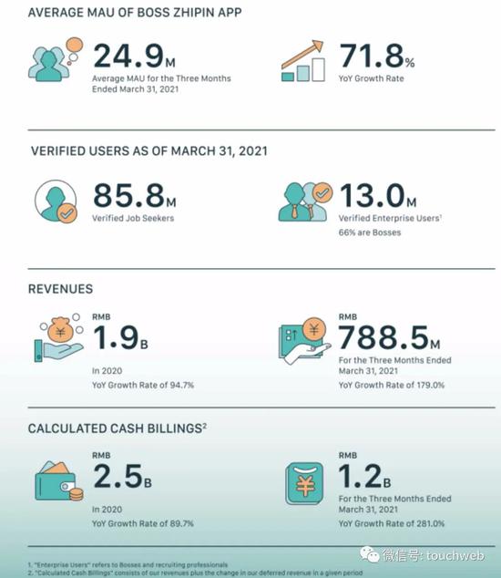 截至2021年3月31日,BOSS直聘共服务8580万认证求职者,包括白领用户、金领用户、大学生及蓝领用户;BOSS直聘共拥有1300万认证企业端用户,服务630万家认证企业。