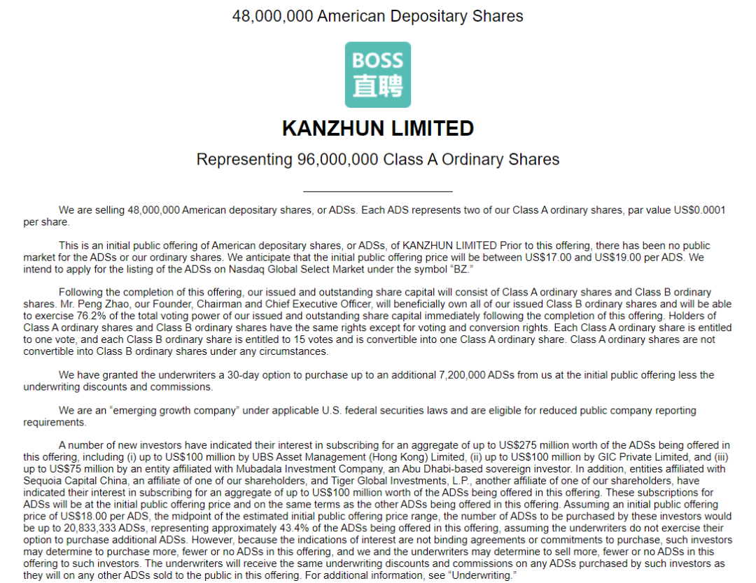 招股书显示,BOSS直聘预计将公开发行4800万股ADS,价格区间为每ADS17-19美元,募资约10亿美元,估值超过80亿美元。依照惯例,BOSS直聘还赋予IPO承销商最多720万股ADS超额配售权。