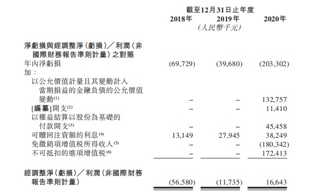 经调整净亏损(非国际财务报告准则计量)由2018年的5658万元大幅减少至2019年的1173.5万元,并进一步扭转为2020年的经调整净利润(非国际财务报告准则计量)1664.3万元。