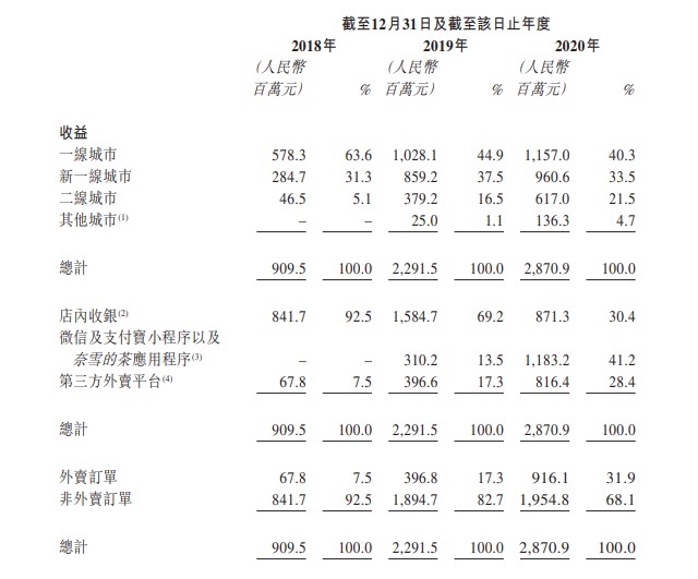 奈雪的茶会员体系有注册会员约3470万名。2020年,奈雪的茶订单总数中约49.0%来自会员。通过微信及支付宝小程序以及奈雪的茶应用程序,客户能够轻松加入会员体系,找到最近的奈雪的茶茶饮店,并轻松下达外卖及自提订单。于2018年、2019年及2020年,奈雪的茶订单中分别约有4.4%、12.5%及22.9%为客户通过微信及支付宝小程序、奈雪的茶应用程序以及其他第三方外卖平台下达的外卖订单。