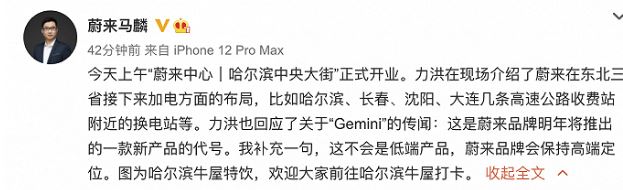 6月6日,蔚来总裁秦力洪回应此前有关“Gemini”的传闻称,这是蔚来品牌明年将推出的一款新产品的代号。蔚来汽车企业传播高级总监马麟则在其个人微博发文补充称,这不会是低端产品,蔚来品牌会保持高端定位。