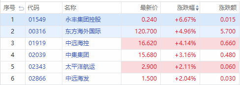 华盛资讯6月7日消息,港口航运股全线走强,截止发稿,永丰集团控股上涨6.67%;东方海外国际上涨4.96%,中远海控上涨4.14%;中集集团上涨3.16%;太平洋航运上涨2.11%。