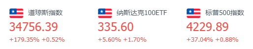道指涨179.35点,或0.52%,报34756.39点;纳指涨199.98点,或1.47%,报13814.49点;标普500指数涨37.04点,或0.88%,报4229.90点。