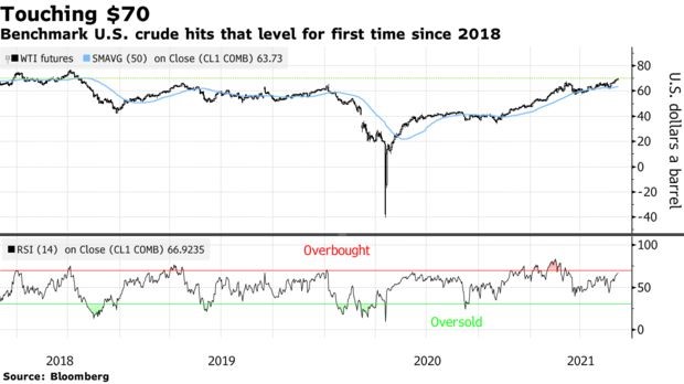 美国财长耶伦认为,美国总统拜登的的4万亿美元支出计划对美国有利,即使这可能导致通胀上升并最终致使利率上调。纽约WTI原油价格自2018年10月以来首次触及每桶70美元。 上周末,比特币价格下跌,成交价约为3.6万美元。