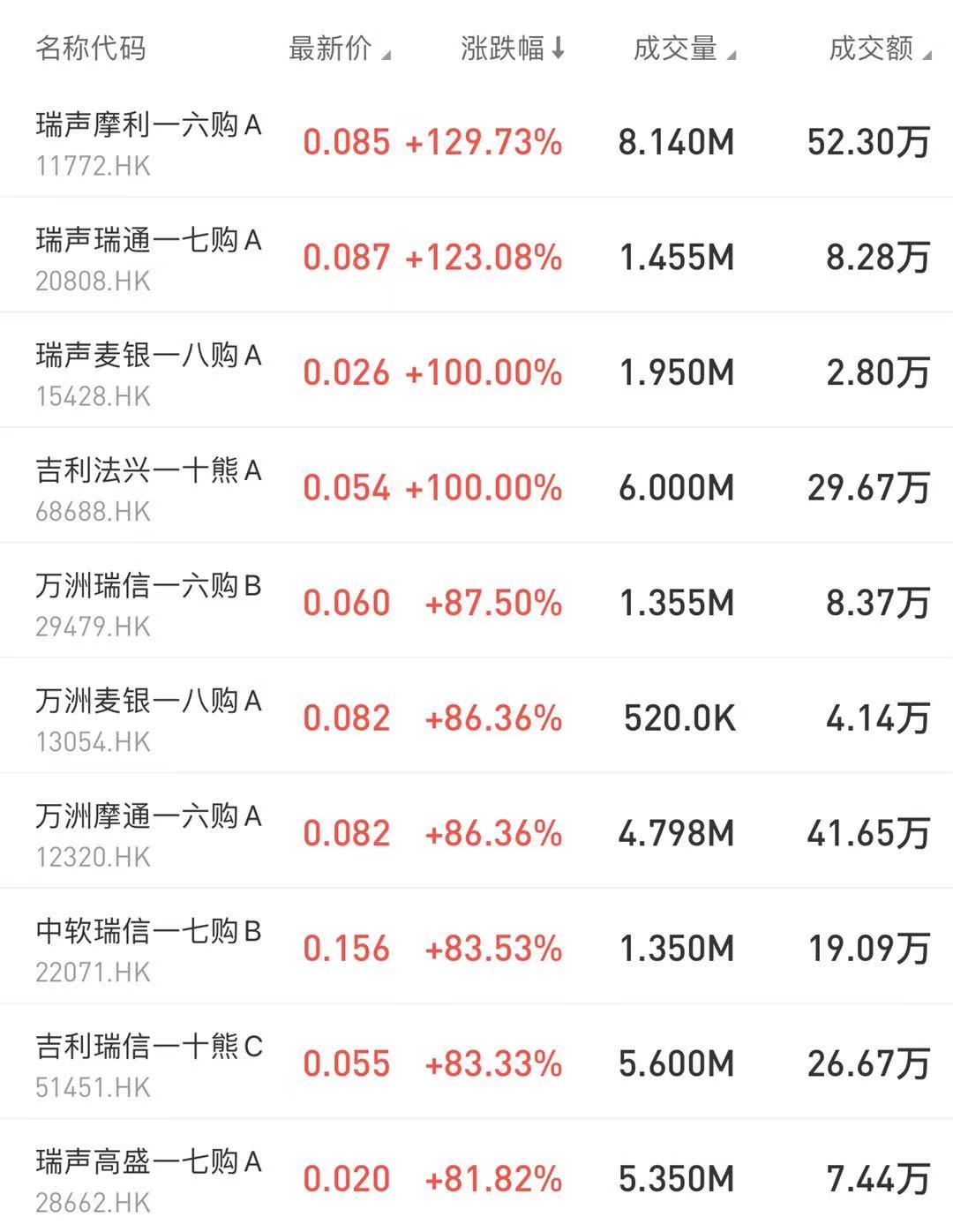 涨幅居前的包括:瑞声摩利一六购A暴涨129.73%;瑞声瑞通一七购A涨123.08%。