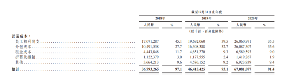 另一方面的亏损则体现为京东物流的高成本运营。投入极高的资金,却未见同比回报,导致其依旧困于“亏损茧房”。招股书显示,京东物流的营业成本包括员工福利开支、外包成本、租金成本、折旧及摊销和其他,仅前两项就占到了整体成本的七成。2018年至2020年第三季度,其营业成本分别为367.9亿元、464.2亿元和440.9亿元,占当期营业收入的比例分别为97.1%、93.1%和89.1%。