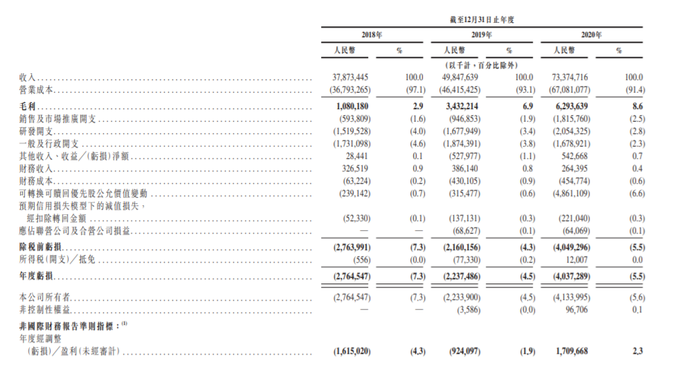 招股书中,2018年,京东物流的毛利为10.8亿元,毛利率为2.9%;2019年为34.32亿元,毛利率为6.9%;2020年前三季度为54.19亿元(2019年前三季度为29亿元),毛利率为10.9%(2019年前三季度为8.5%)。不过值得一提的是,尽管毛利率的基本数据在提升,但京东物流对自己的营运前景并不乐观,京东物流既没有在营收上做到开源,也没有在成本上实现节流。