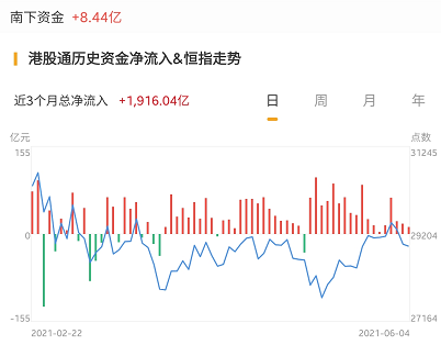南下资金今日净流入港股高达8.44亿港元,上周五为净流入超12亿港元。