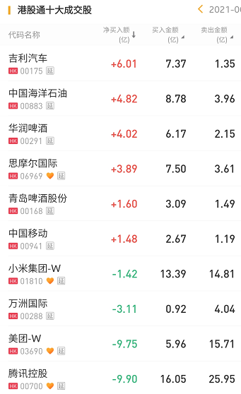 个股方面,今日南下资金净买入吉利汽车6.01亿港元,为今日买入之最。此外,南下资金净买入中国海洋石油4.82亿港元,净买入华润啤酒4.02亿港元。