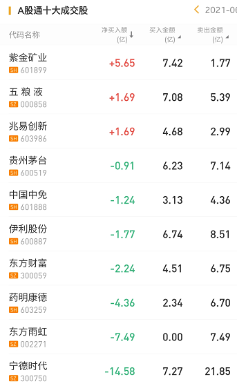 北上资金今日净买入紫金矿业5.65亿元,为今日买入之最。此外,北上资金净买入五粮液1.69亿元,净买入兆易创新1.69亿元。