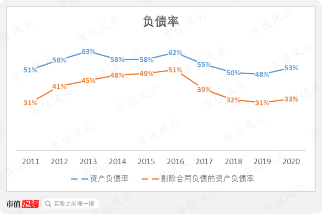 公司资产负债率目前处于近年来的低位,2020年末为53%。而如果剔除掉合同负债,那么同期的负债率仅为33%,较2016年大幅下降18个百分点。