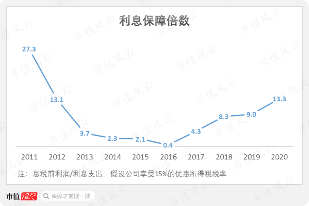 采用相对保守的方式计算利息保障倍数,可以看到公司目前的安全边界充足,2020年达到13.3倍。