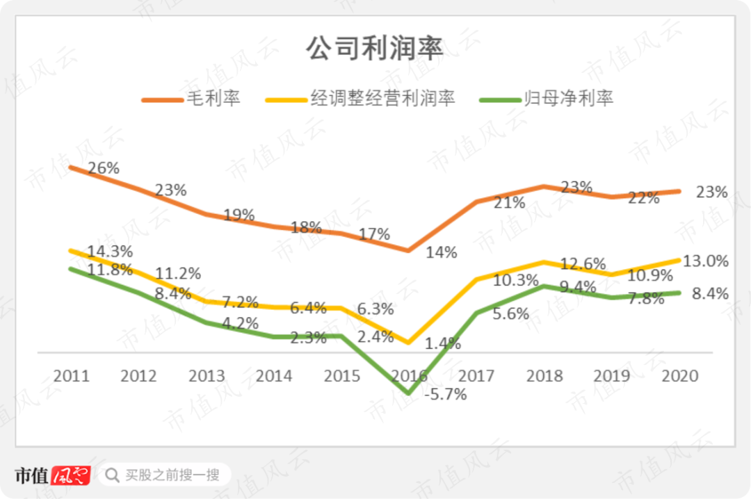 公司的毛利率、经调整经营利润率,以及归母净利率在过去10年走出了一条“V”型线。