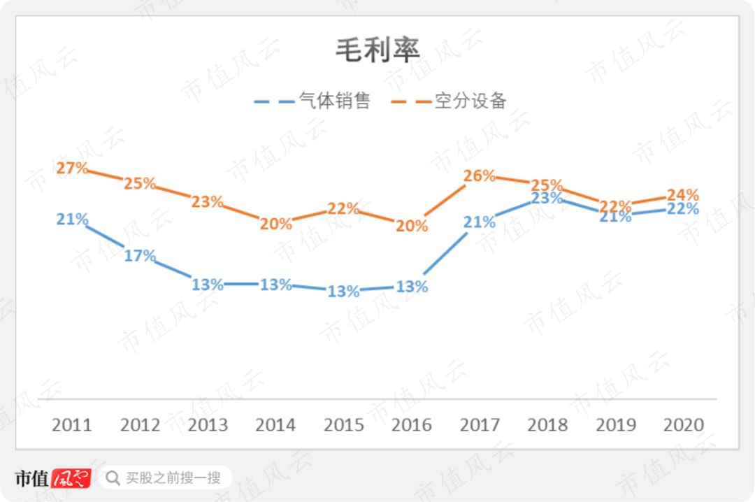 2017年,气体销售毛利率从13%跳涨到21%,而空分设备则是从20%到26%。
