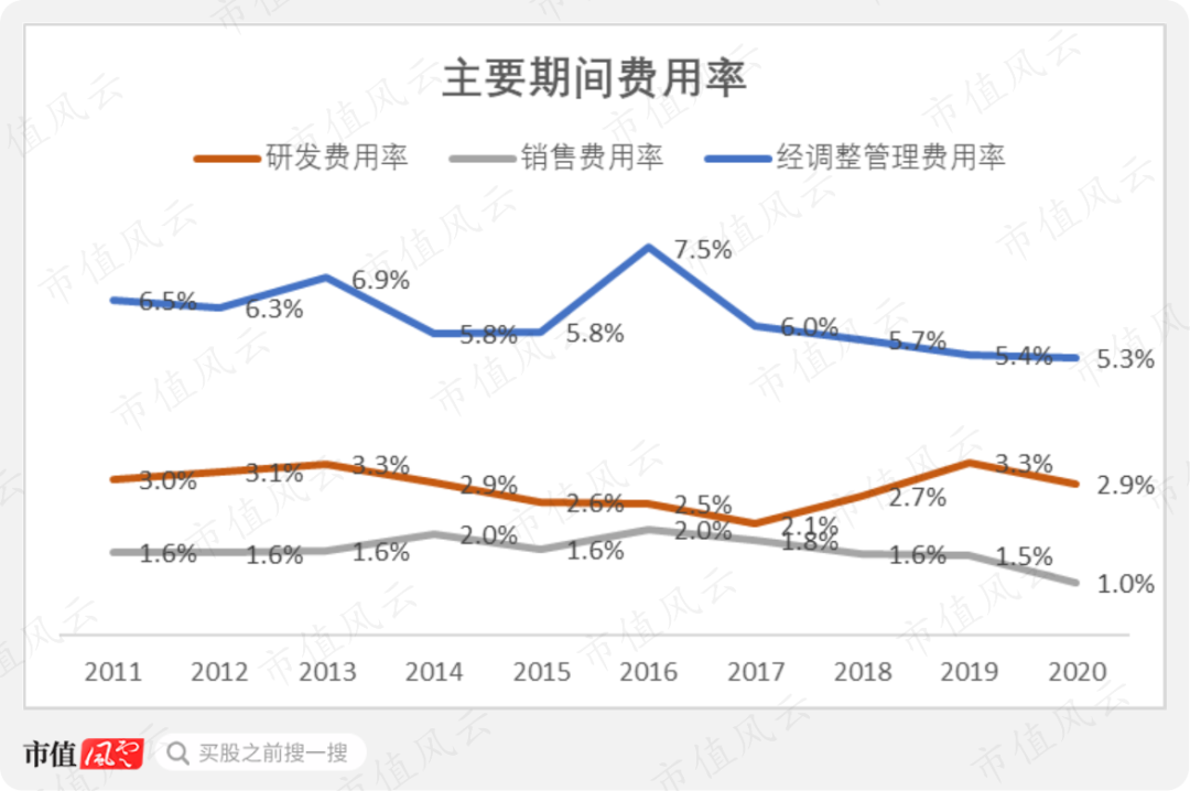但公司的研发费用率并不高,10年当中仅有4年超过3%,最高为2013年和2019年创出的3.3%,剩余6年都在2-3%之间。