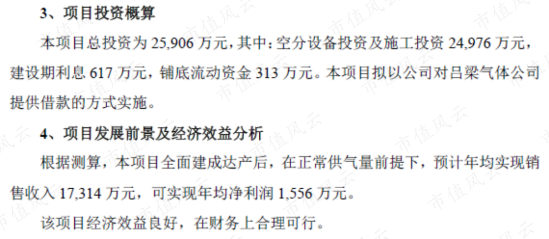 我们以当中吕梁5万标方每小时空分项目为例,公司在2020年2月投资2000万设立吕梁杭氧气体有限公司,持股100%。预计项目投资2.6亿,由公司向客户华盛化工及山西亚鑫新能科技有限公司提供工业气体产品(氧气、氦气)及服务,合同期15年。