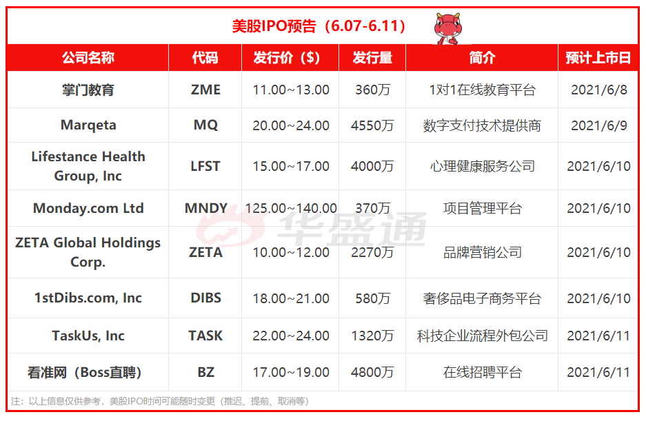本周美股IPO市场预计将迎来8只新股,涉及在线教育、数字支付及心理治疗服务等领域。其中包括两只热门中概股,掌门教育和Boss直聘。话不多说,让我们来看看这周的新股都有哪些看点吧~