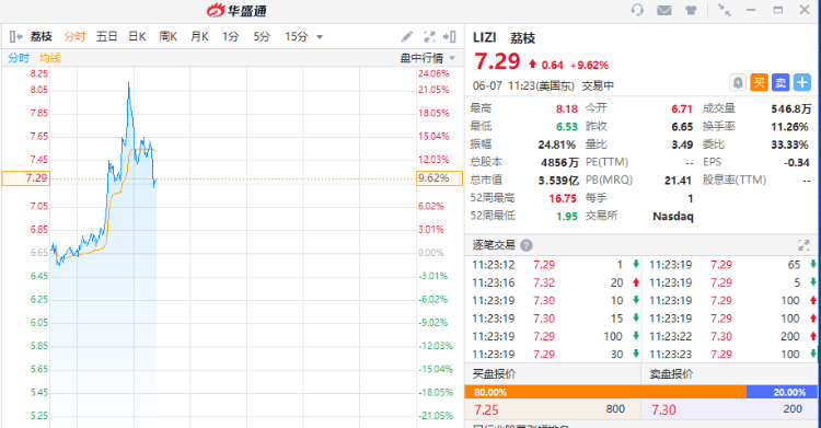 6月7日(周一),荔枝(LIZI)股价上涨,截至发稿,该股一度涨超20%,现报7.29美元。公司2021年一季度营收同比增长34%,达到4.95亿元人民币,超出市场预期。