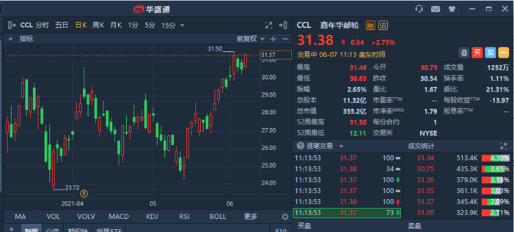 截止发稿,嘉年华邮轮盘初涨近3%,报31.38美元。