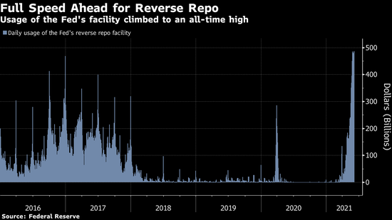 美联储用于控制短期利率的一项工具的需求飙升至纪录最高水平,因海量现金正寻找去处。