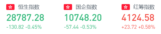 周一(6月7日)收盘,恒指跌0.45%,报28787.28点,国企指数跌0.53%,报10748.20点;红筹指数涨0.58%,报4124.58点。