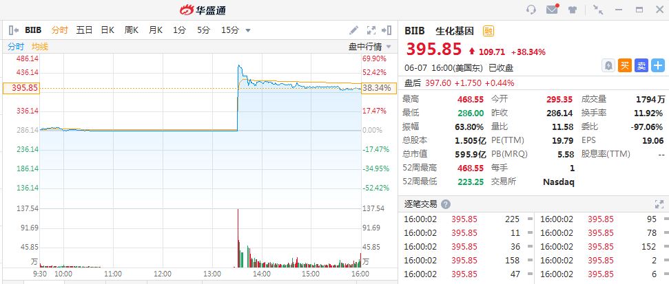 美国食品和药物管理局(FDA)周一批准了Biogen公司治疗阿尔茨海默症的药物aducanumab,使其成为美国监管机构批准的第一种减缓阿尔茨海默症患者认知能力下降的药物,也是近20年来首款治疗该疾病的新药。消息传出后,Biogen股价一度暴涨近60%,触发两次熔断,Biogen最终收涨38.34%。