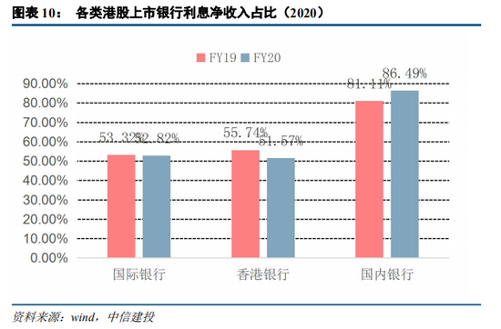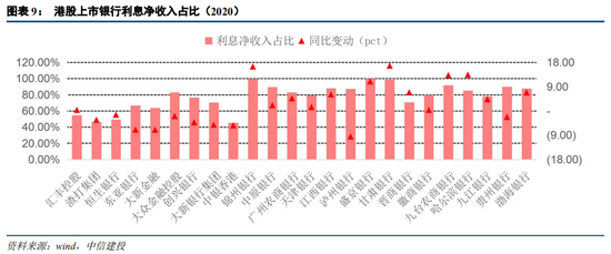 只在港股上市的国内银行利息净收入占比明显上升,除泸州银行、贵州银行同比下降外,其他国内银行占比均同比提升。其中锦州银行、盛京银行、甘肃银行的利息净收入接近100%,占比同比上升超过10个百分点。